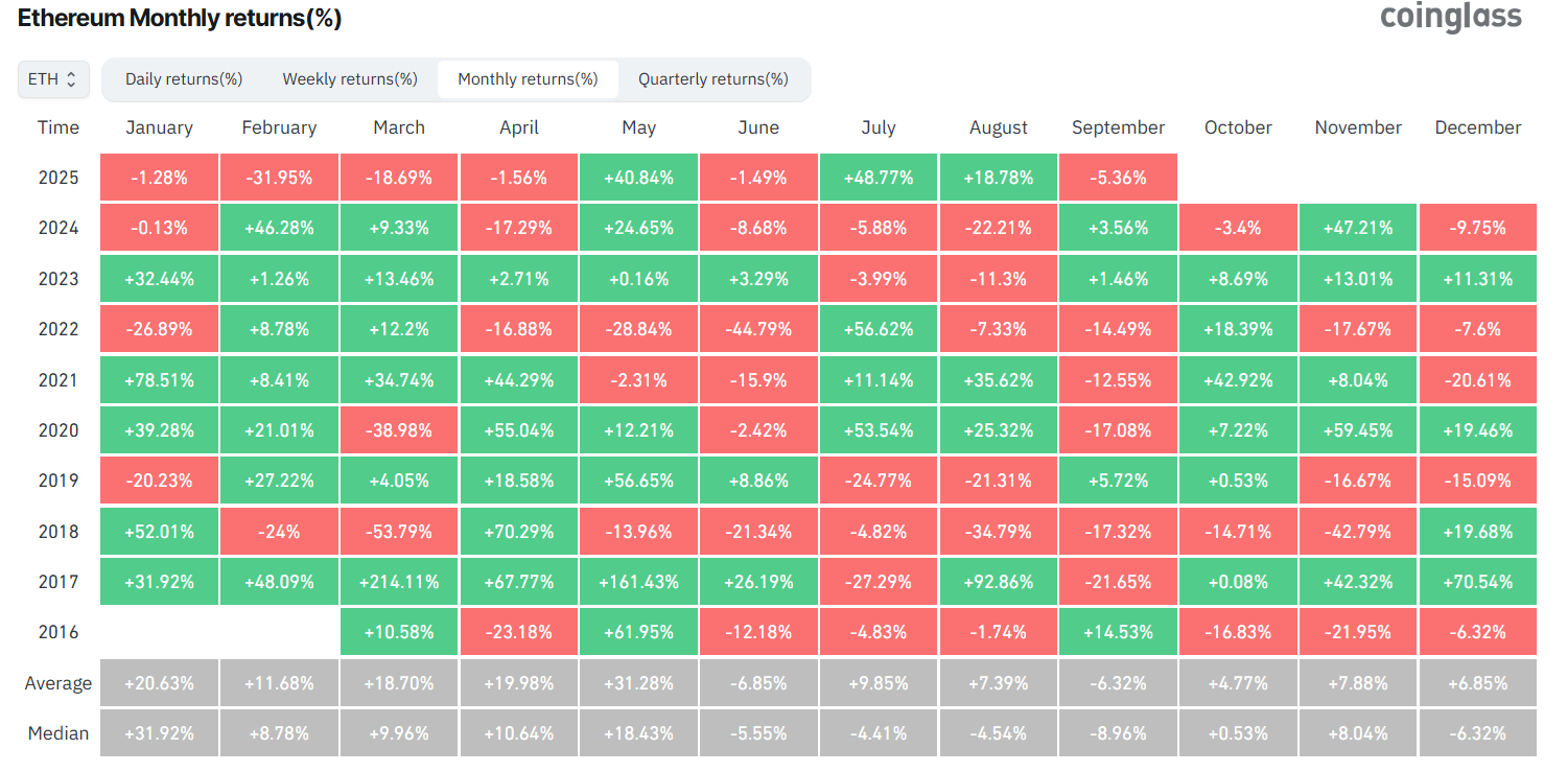 Giá Ethereum giảm -6% trong suốt tháng 9, phù hợp với mức trung bình lịch sử của một tháng thường yếu đối với Ethereum. Theo dữ liệu từ CoinGlass, tháng 10 trở đi thường là những tháng tăng giá cho ETH, với mức lợi nhuận là 8,84%. Hơn nữa, dữ liệu cũng cho thấy trong những trường hợp ETH giảm trong tháng 9, sau đó lại tăng trưởng trở lại vào tháng 10, và trong hầu hết các trường hợp, mức tăng này đều đạt hai chữ số. Tuy nhiên, cần lưu ý rằng hiệu suất trong quá khứ không phản ánh mức tăng trưởng trong tương lai.