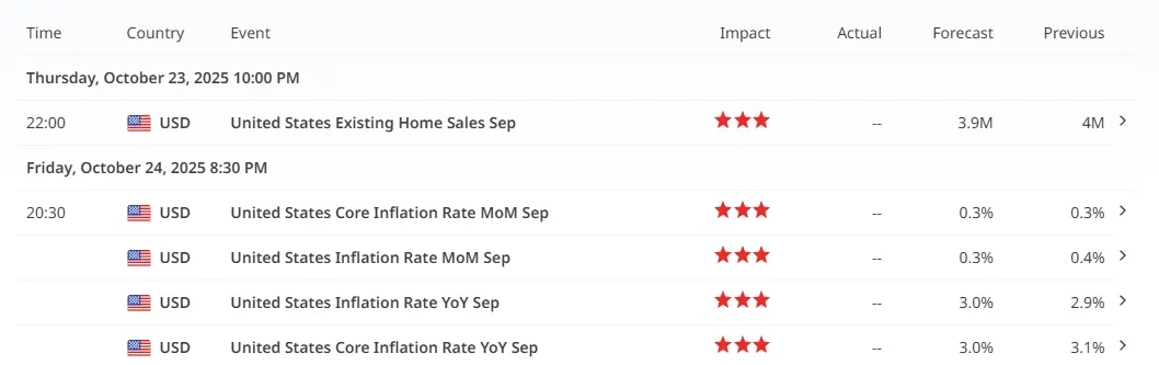 - CPI được lùi đến ngày 24 tháng 10 do tình trạng đóng cửa chính phủ Hoa Kỳ khiến việc công bố dữ liệu quan trọng phải dừng lại và buộc Cục Thống kê Lao động (BLS) phải triệu hồi một số nhân viên hạn chế.