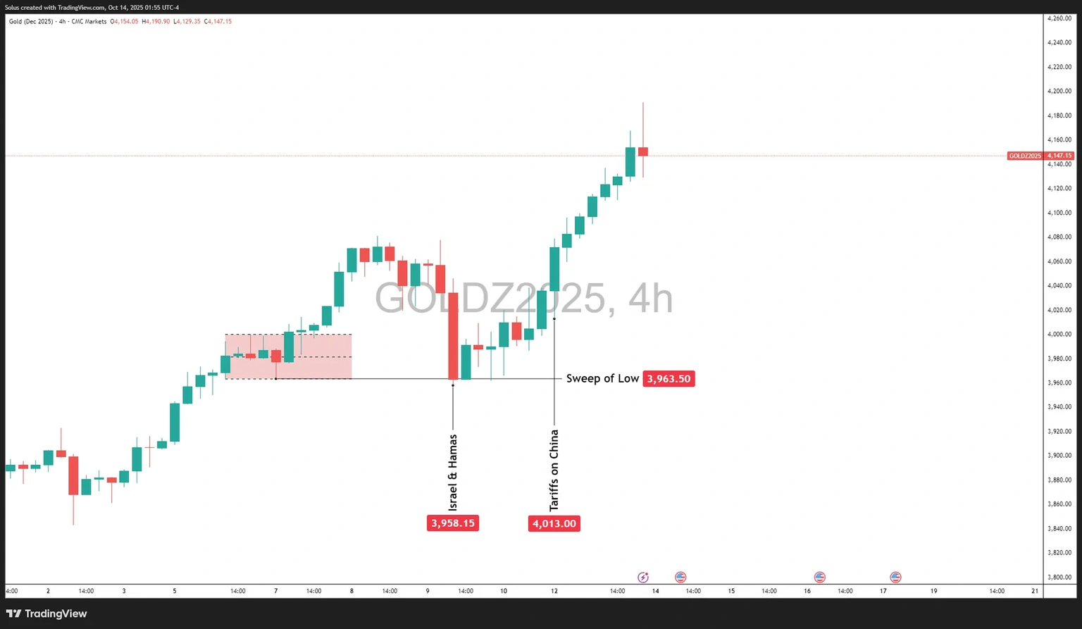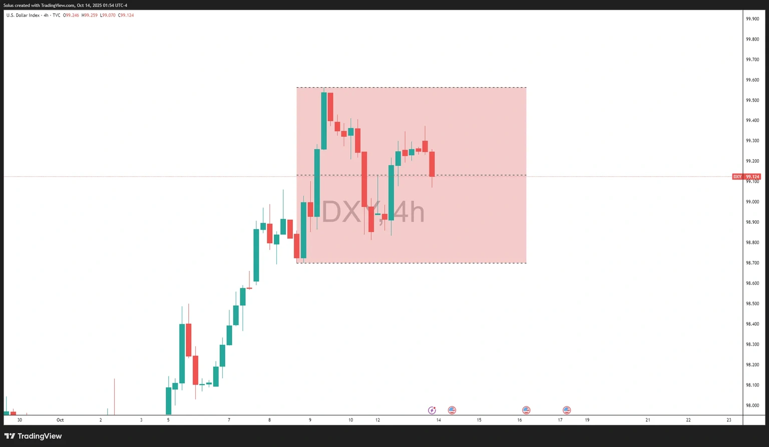 Chỉ số Đô la Mỹ (DXY) vẫn bị khóa trong phạm vi hẹp H4 , phản ánh sự bất ổn chung đang bao trùm thị trường toàn cầu. Với việc CPI bị trì hoãn và NFP không được công bố trong lịch, biến động đã bị nén lại thành một cấu trúc cuộn. Trong khi đó, vàng tiếp tục thu hút dòng vốn phòng thủ, giữ vững trên mức 4.200 đô la trong bối cảnh lợi suất thực tế đang giảm dần.
