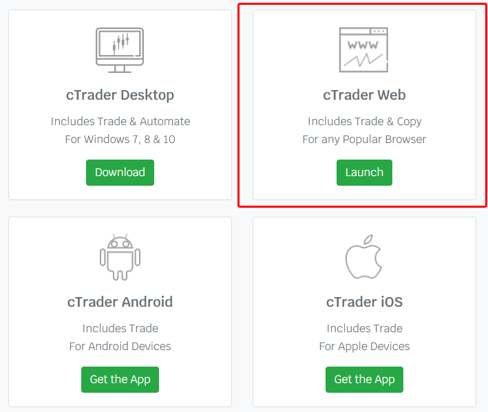 Sau khi truy cập trang ctrader.com/download/, chúng ta có thể thấy ngay nút khởi chạy cho nền tảng web của phần mềm này. Anh em hãy nhấn Launch để mở nền tảng lên và đăng nhập tài khoản của mình nhé. (mydelta8store.com)