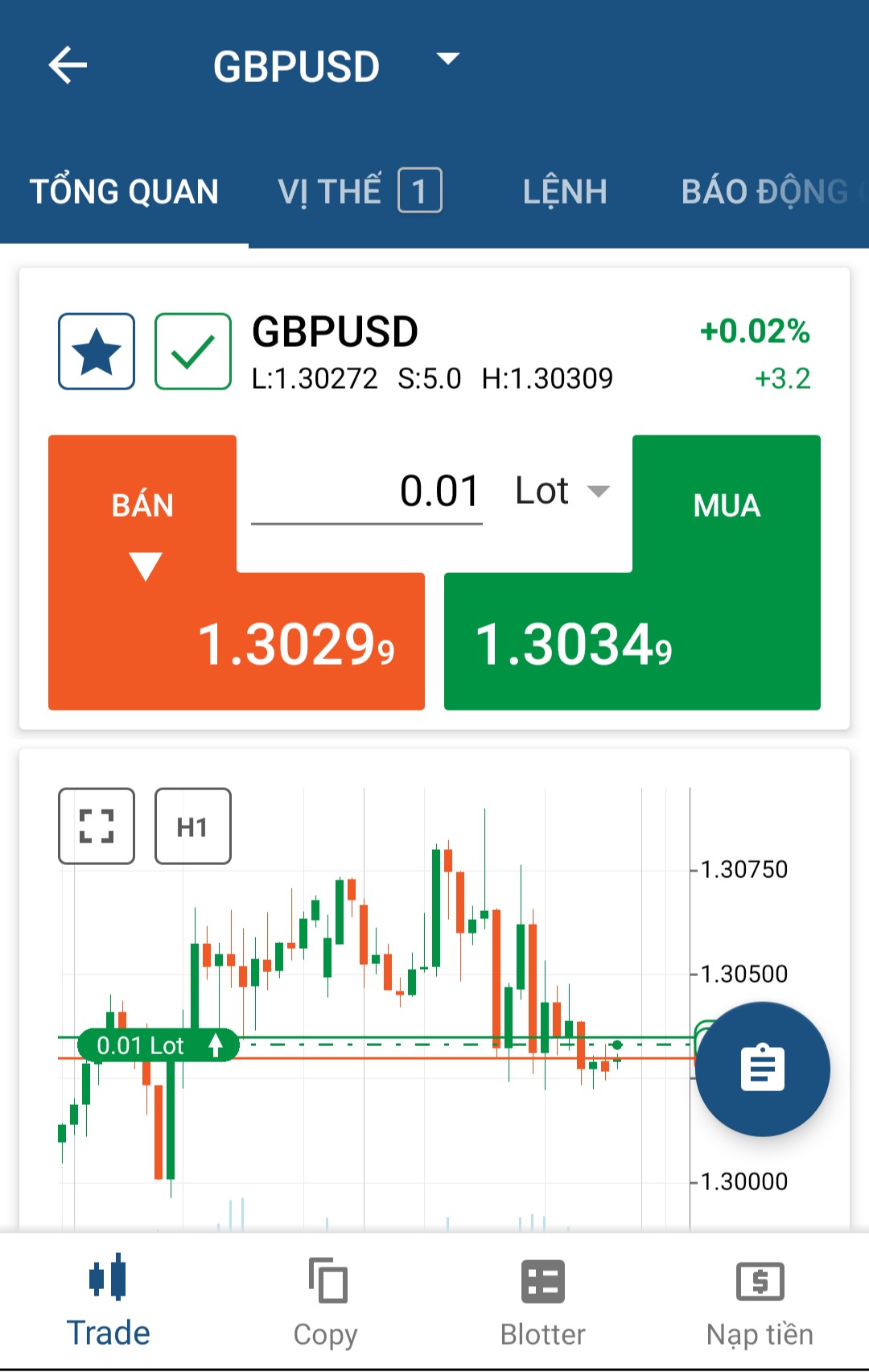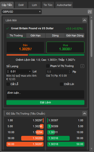 Sau đó, anh em sẽ thấy ngay khu vực đặt lệnh ở phía trên cùng. Ở đó chúng ta có thể điều chỉnh khối lượng vào lệnh, sau đó đặt lệnh mua hoặc bán ngay lập tức theo giá thị trường.