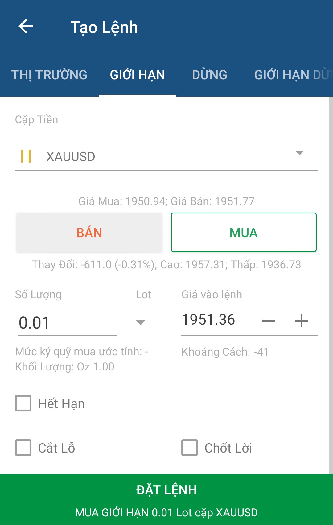 Cách thứ hai để thực hiện lệnh giao dịch, đó là ở màn hình chính anh em mở Menu với ký hiệu 3 dấu gạch ngang phía trên bên trái, sau đó chọn “Lệnh mới”. Tại đây anh em có thể chọn cặp tiền, chọn loại lệnh và thiết lập luôn stop loss cũng như take profit đầy đủ trước khi vào lệnh.