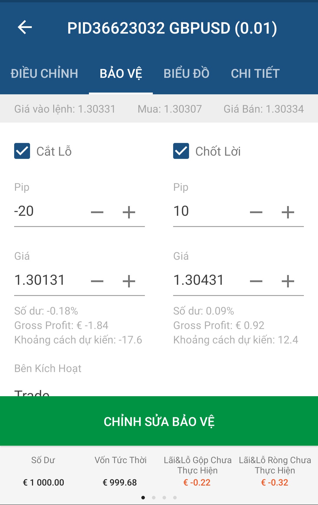 Tiếp theo, anh em chọn “Vị thế” rồi chuyển sang tab “Bảo vệ” để thực hiện thiết lập stop loss và take profit.