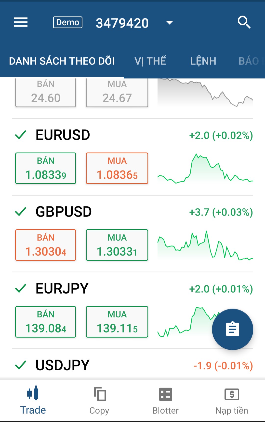Ở ứng dụng cTrader trên di động, đầu tiên anh em hãy mở biểu đồ cặp tiền mà mình muốn giao dịch bằng cách trực tiếp nhấn vào cặp tiền đó trên màn hình chính.