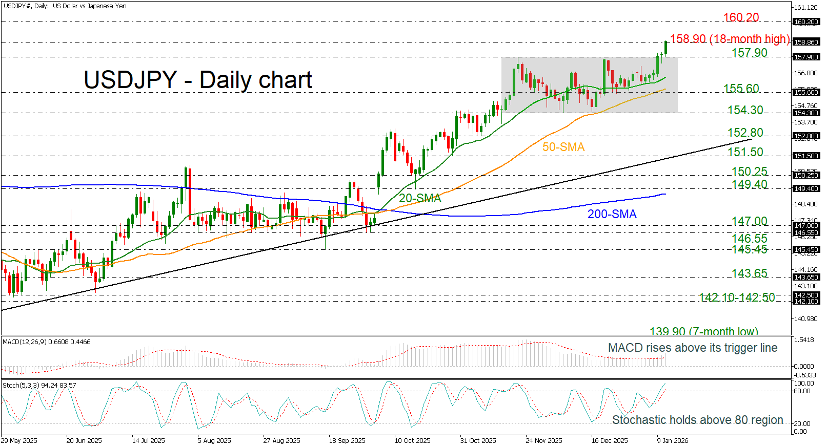Ngược lại, nếu giá giảm xuống dưới mức hỗ trợ 157,90, xu hướng có thể chuyển về trạng thái trung lập, đưa các đường trung bình động đơn giản (SMA) 20 ngày và 50 ngày ở mức 156,65 và 155,85 vào tầm ngắm.