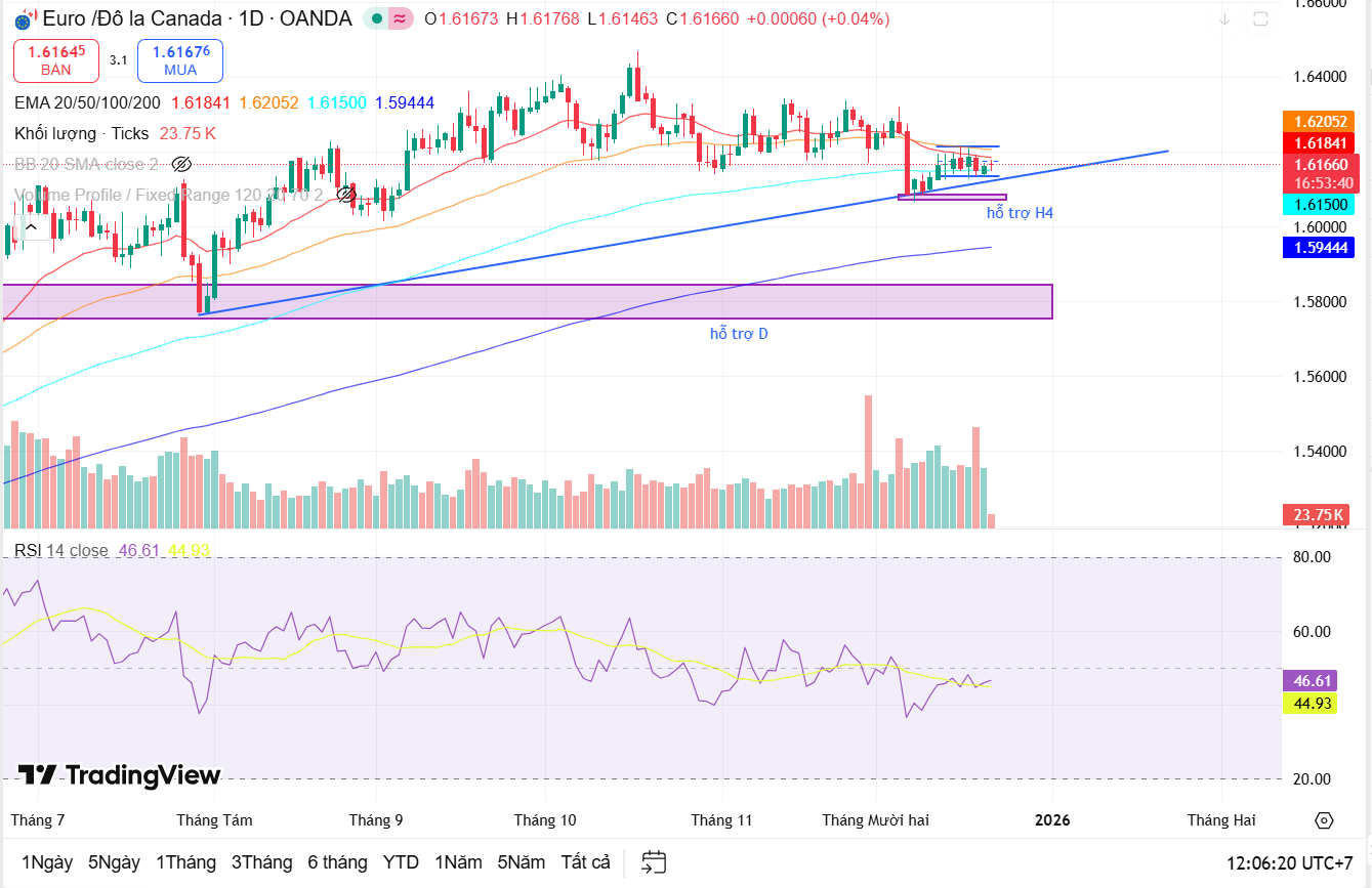 Trong bối cảnh thị trường bước vào giai đoạn nghỉ lễ cuối năm, thanh khoản suy giảm rõ rệt và thiếu vắng các chất xúc tác vĩ mô mới, EUR/CAD nhiều khả năng sẽ tiếp tục duy trì trạng thái đi ngang trong những phiên còn lại trước năm mới. Cấu trúc kỹ thuật đa khung cho thấy xu hướng trung hạn chưa bị phá vỡ, nhưng động lực ngắn hạn không đủ mạnh để hình thành một pha bứt phá đáng tin cậy.