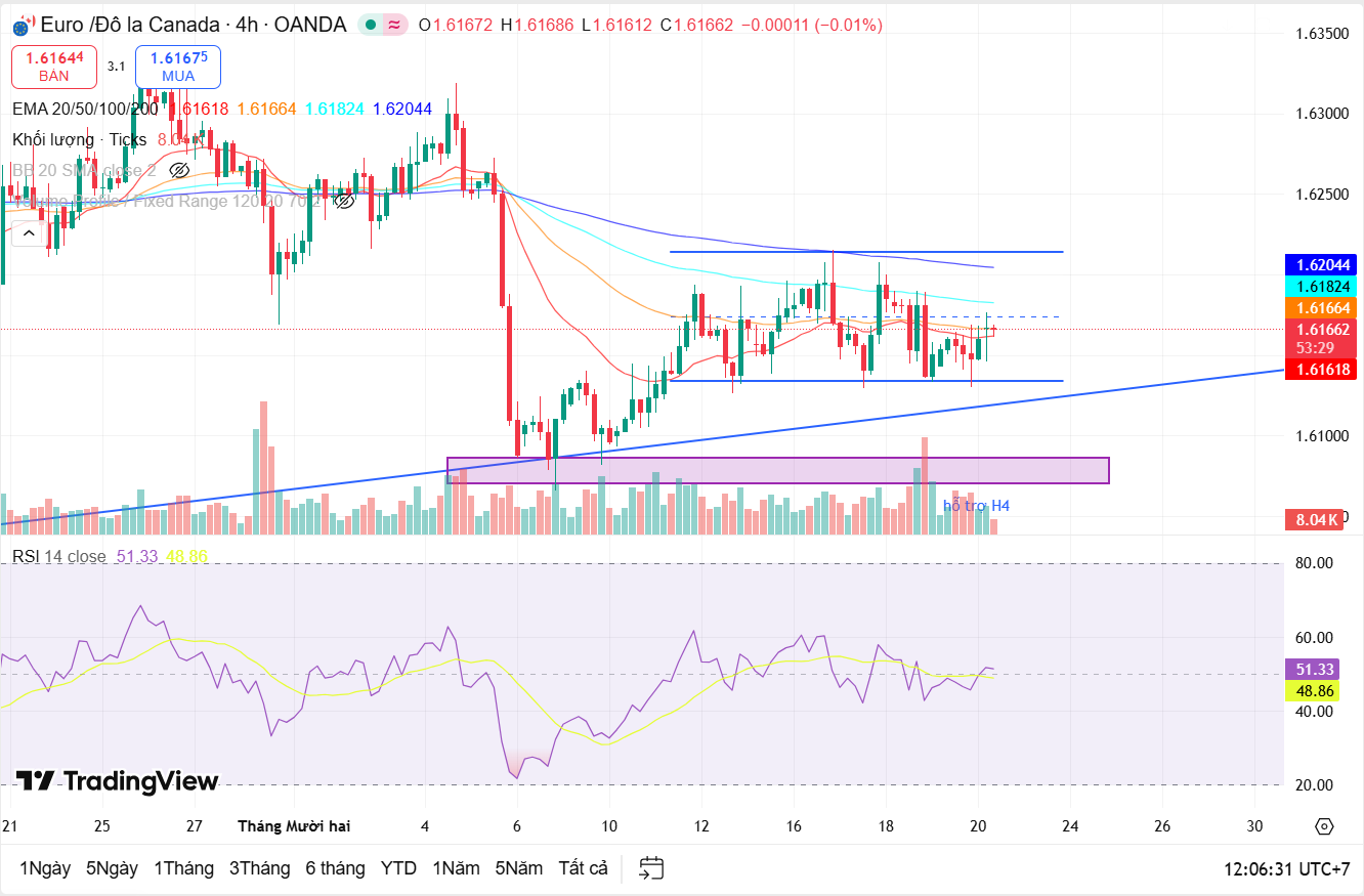 Trên khung ngày, EUR/CAD vẫn duy trì cấu trúc tăng trung hạn khi giá nằm trên EMA200 và đường trendline tăng kéo dài từ tháng 8. Tuy nhiên, cần lưu ý rằng đà tăng đã chậm lại rõ rệt trong suốt tháng 12. Giá liên tục đi ngang ngay bên dưới cụm EMA20–50, cho thấy lực mua không còn đủ mạnh để tạo xu hướng tiếp diễn.
