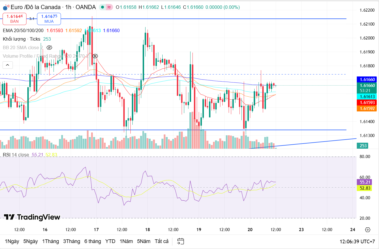 Khung H1 cho thấy EUR/CAD đang di chuyển trong một hộp giá rõ ràng, với đáy quanh 1.613 và trần quanh 1.618–1.619. Các nhịp tăng giảm luân phiên nhưng thiếu sự mở rộng biên độ, phản ánh hoạt động chủ yếu của dòng tiền ngắn hạn.