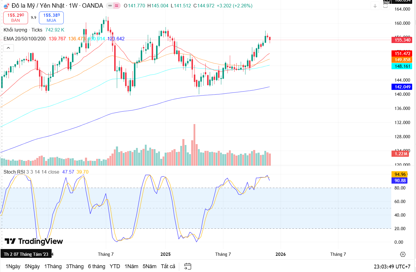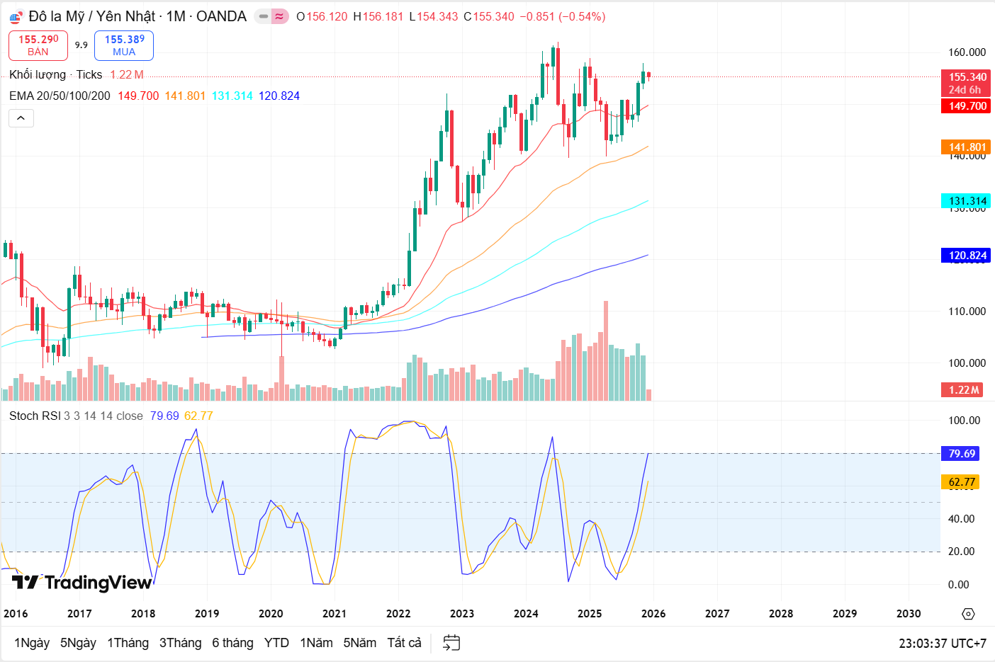 Trên biểu đồ hàng tháng, cặp USD/JPY đang thể hiện một xu hướng tăng giá dài hạn mạnh mẽ kể từ năm 2021. Hành động giá hiện tại nằm trên tất cả các đường EMA (20, 50, 100, 200), cho thấy động lực tăng giá vững chắc. Đường EMA 20 đang đóng vai trò là mức hỗ trợ động chính. Khối lượng giao dịch gần đây cho thấy sự quan tâm tiếp tục của thị trường đối với việc mua vào.