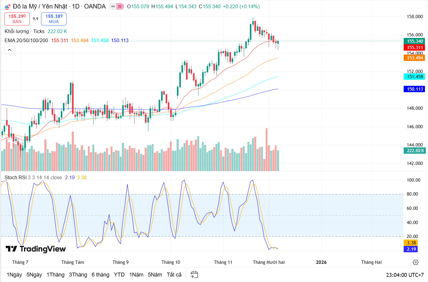 Phân tích đa khung thời gian cho thấy xu hướng tăng giá dài hạn của USD/JPY là không thể phủ nhận. Khung Tháng và Tuần đều cho thấy động lực tăng giá mạnh mẽ, với giá nằm trên tất cả các đường trung bình động chính. Khung Ngày đang cảnh báo về một đợt điều chỉnh ngắn hạn, với Stoch RSI ở vùng quá bán cực độ, tạo cơ hội cho những người mua tiềm năng tham gia thị trường ở mức giá tốt hơn.