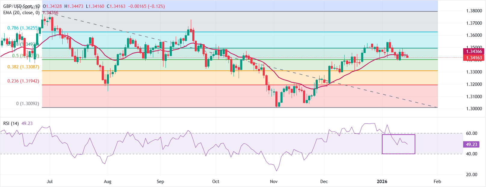 Tỷ giá GBP/USD đang giao dịch thấp hơn, gần mức 1.3420 vào thời điểm viết bài. Đường trung bình động lũy thừa (EMA) 20 ngày ở mức 1.3438 đã đi ngang sau một đợt tăng ổn định, và giá đang dao động quanh mức này.