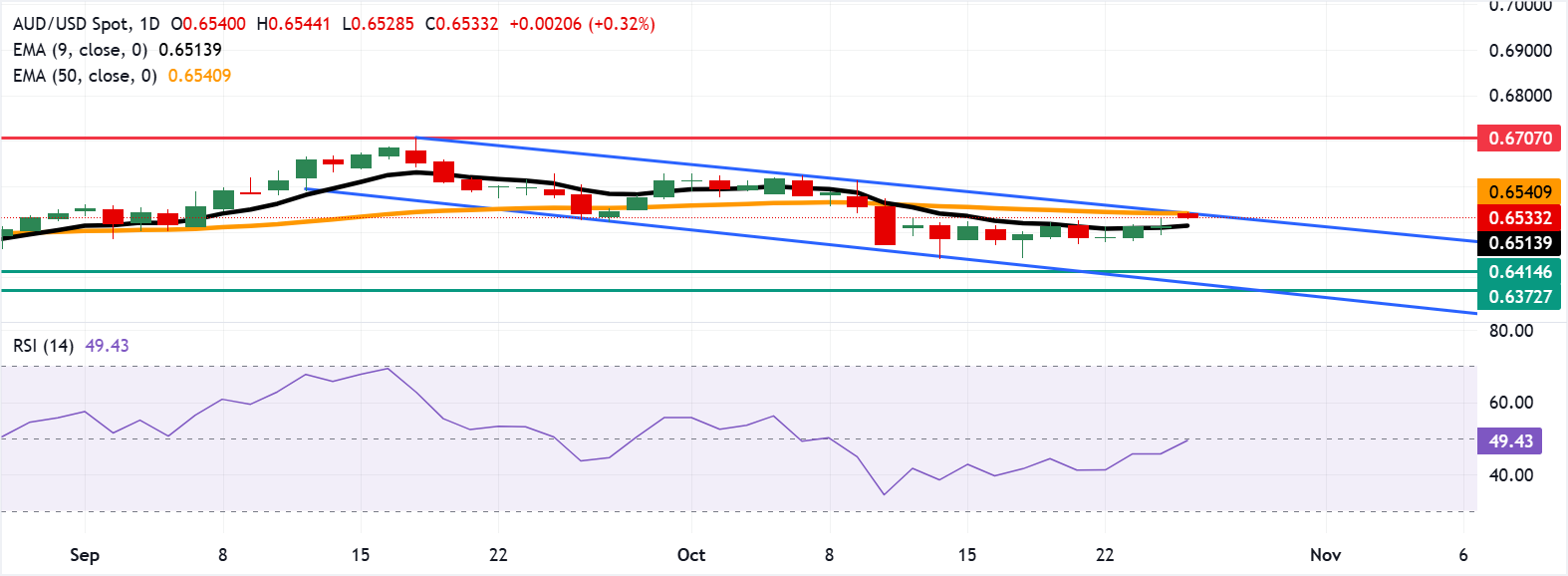 AUD/USD đang giao dịch quanh mức 0,6530 vào thứ Hai. Phân tích kỹ thuật trên biểu đồ hàng ngày cho thấy xu hướng giảm giá có khả năng suy yếu, khi cặp tiền này nằm gần ranh giới trên của kênh giảm dần. Cặp tiền này đang giao dịch phía trên đường Trung bình Động Hàm mũ (EMA) chín ngày, cho thấy đà tăng giá ngắn hạn đang mạnh hơn.
