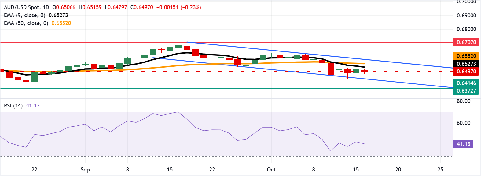 Cặp AUD/USD đang giao dịch quanh mức 0,6500 vào thứ Năm. Phân tích kỹ thuật trên biểu đồ hàng ngày cho thấy xu hướng giảm giá đang tiếp diễn khi cặp tiền này vẫn nằm trong mô hình kênh giảm dần. Ngoài ra, Chỉ số Sức mạnh Tương đối (RSI) 14 ngày vẫn nằm dưới mức 50, củng cố xu hướng giảm giá.