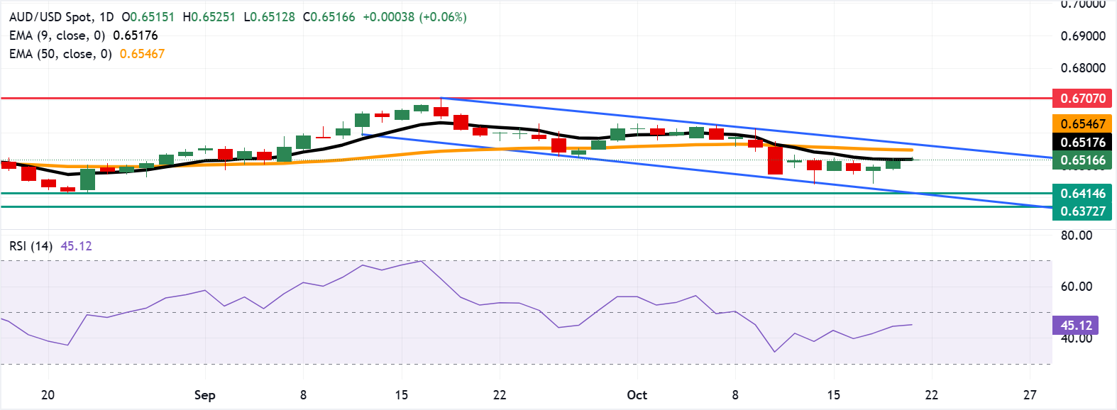 AUD/USD đang giao dịch quanh mức 0,6510 vào thứ Ba. Phân tích kỹ thuật trên biểu đồ hàng ngày cho thấy xu hướng giảm giá dai dẳng, với cặp tiền này đang giao dịch trong một kênh giảm dần. Chỉ báo RSI 14 ngày vẫn nằm dưới mức 50, củng cố triển vọng giảm giá .