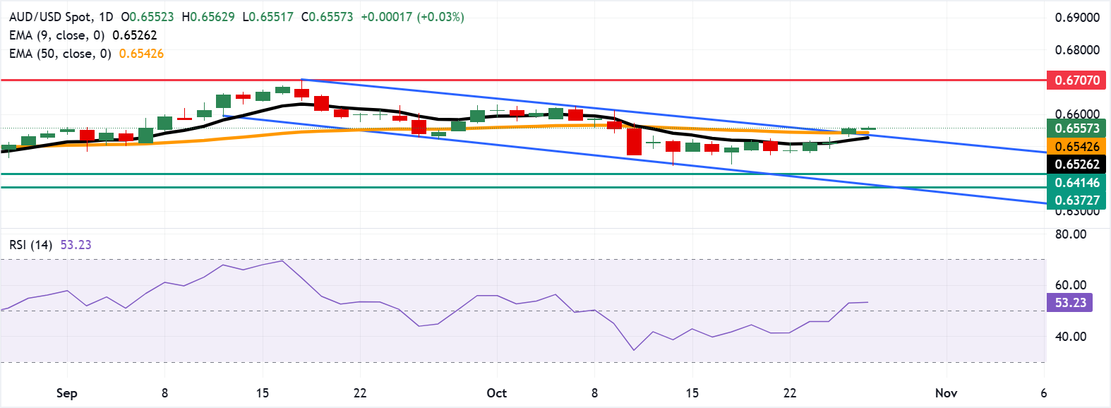 AUD/USD đang giao dịch quanh mức 0,6560 vào thứ Ba. Phân tích kỹ thuật trên biểu đồ hàng ngày cho thấy sự đảo chiều tăng giá khi cặp tiền này nằm trên đường biên trên của kênh giảm dần một chút. Cặp tiền này cũng đang giao dịch trên đường trung bình động hàm mũ (EMA) 9 và 50 ngày, cho thấy đà tăng giá cả ngắn hạn và trung hạn vẫn mạnh.