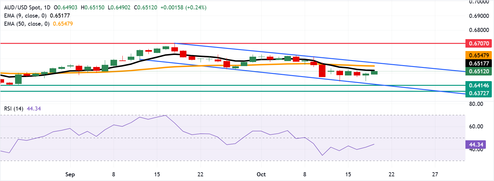 AUD/USD đang giao dịch quanh mức 0,6510 vào thứ Hai. Phân tích kỹ thuật trên biểu đồ hàng ngày cho thấy xu hướng giảm giá kéo dài, với cặp tiền này đang giao dịch bên trong một kênh giảm dần. Chỉ báo RSI 14 ngày vẫn nằm dưới mức 50, củng cố triển vọng giảm giá .