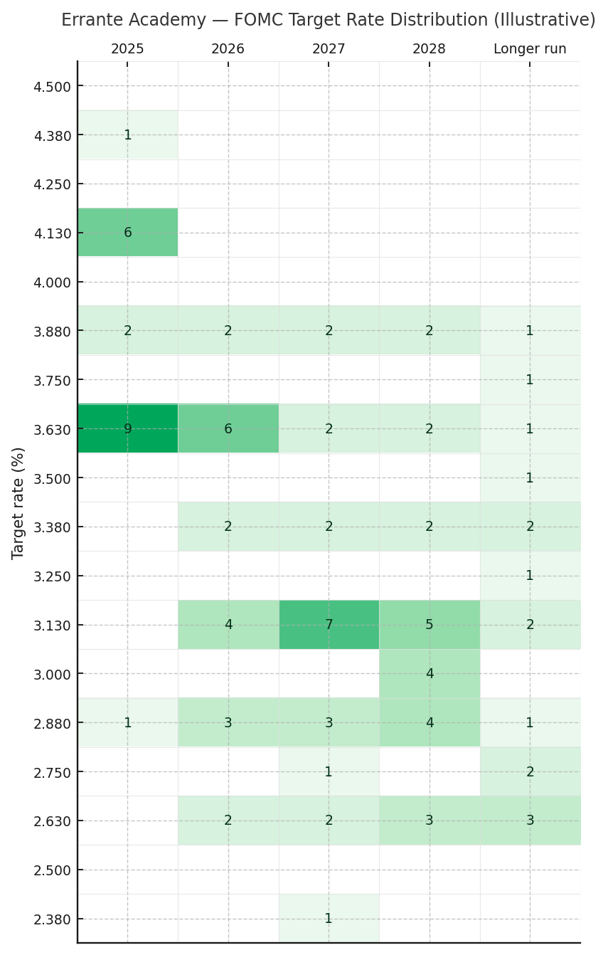 Biểu đồ điểm trước mắt chúng ta cho thấy câu chuyện thực sự. Phần lớn các dự báo đều ở mức khoảng 3,6% cho năm 2025, giảm dần xuống khoảng 3,0–3,1% trong giai đoạn 2026–2027 và mức "trung lập" dài hạn dưới 2,75%. Đây là một thế giới mà: