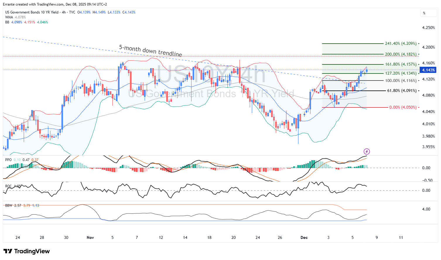 Lợi suất trái phiếu kỳ hạn 10 năm của Hoa Kỳ đã bật mạnh từ vùng 4,05% và hiện đang giao dịch quanh mức 4,14% trên biểu đồ 4 giờ của chúng tôi, tiến vào nhóm Fibonacci ngắn hạn giữa 4,16% và 4,21%. Động lượng (PPO) đang tích cực và tăng lên, ROC đã tăng lên và dải Bollinger đang mở rộng - những dấu hiệu điển hình của một động thái bốc đồng hơn là nhiễu ngẫu nhiên.