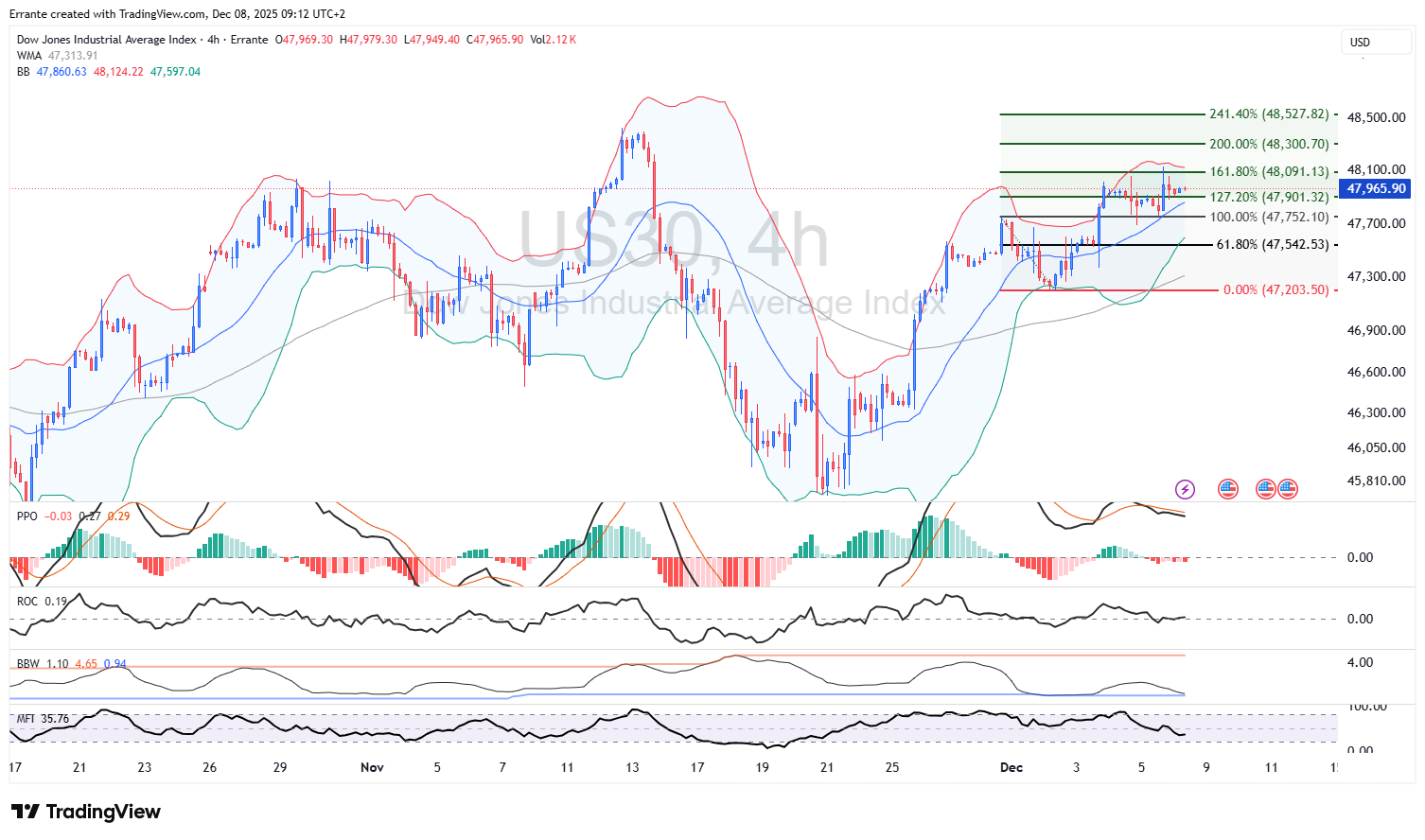 Chỉ số trung bình công nghiệp Dow Jones trên biểu đồ 4 giờ đang củng cố ngay dưới mức 48.000 điểm sau một đợt tăng mạnh. Chỉ số này đang kẹt giữa: