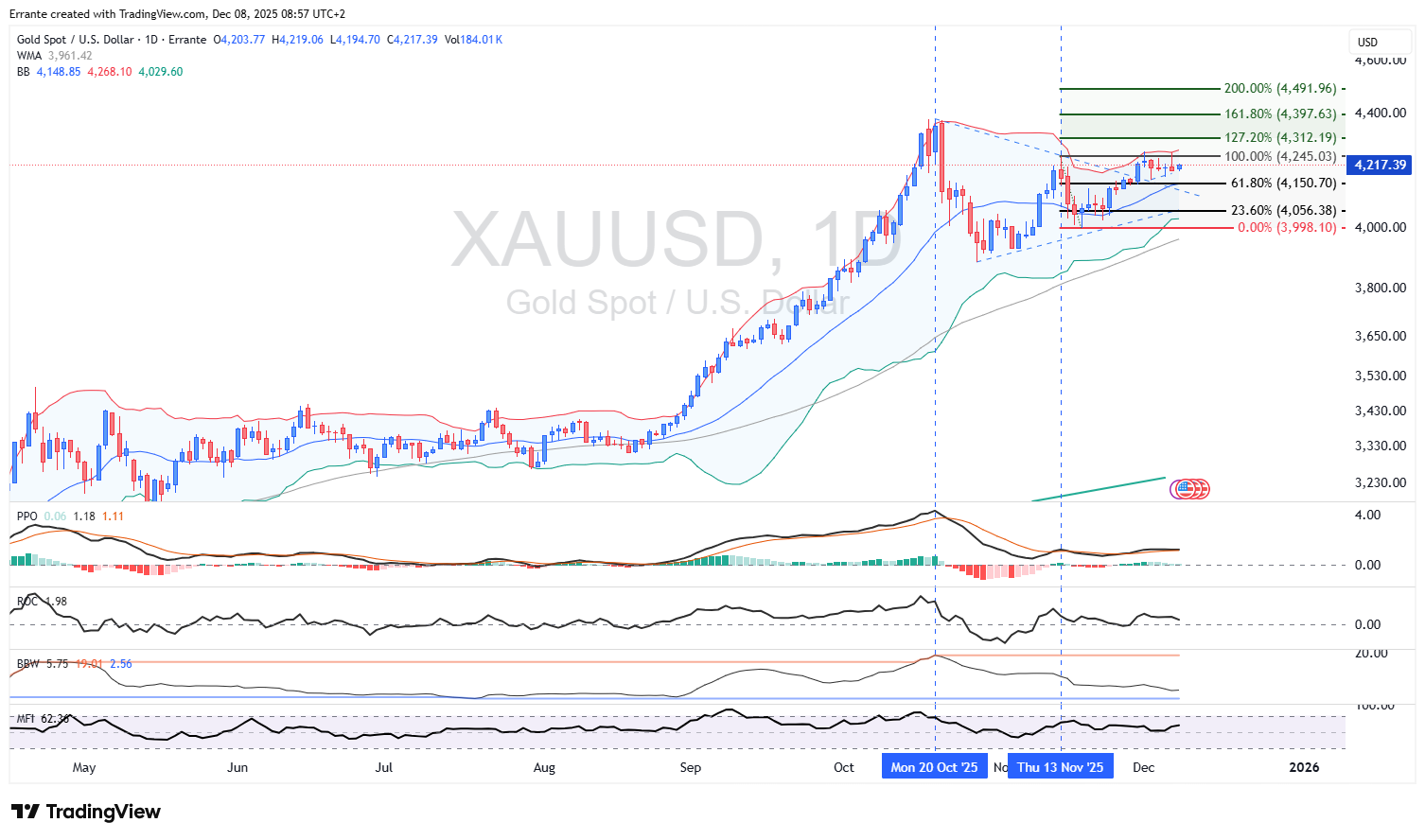 Biểu đồ hàng ngày của vàng trông giống như một lò xo xoắn. Sau đợt tăng giá parabol vào đầu tháng 11, giá đã dành nhiều tuần để xây dựng một phạm vi đi ngang trong khoảng từ 4.150 đến 4.245.