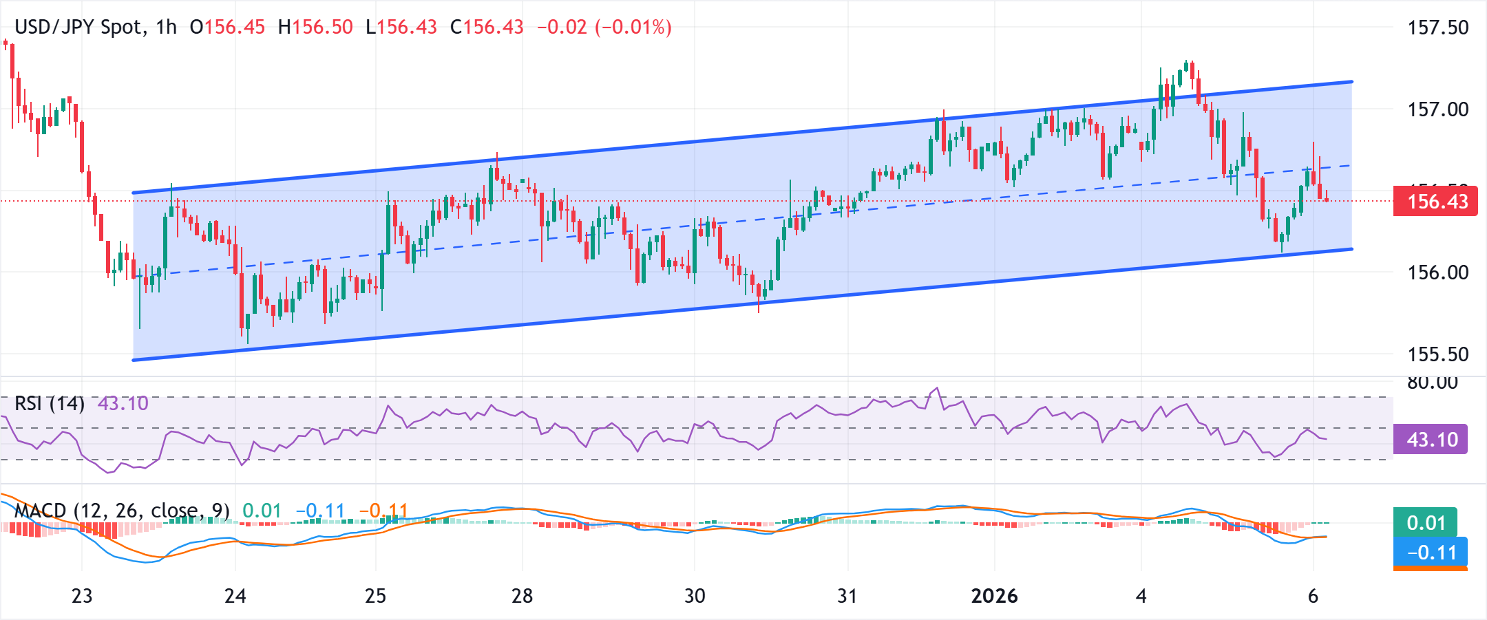 Kênh tăng giá từ mức 155,46 hỗ trợ xu hướng tăng, với ranh giới dưới gần 156,13 giúp giảm thiểu các đợt điều chỉnh. Các đường trung bình động ngắn hạn đã đi ngang, phản ánh sự củng cố trong cấu trúc tăng giá. Chỉ báo MACD (Moving Average Convergence Divergence) chỉ nhích lên trên đường số 0, cho thấy áp lực giảm giá đang suy yếu. Chỉ báo RSI ở mức 43 (trung lập), cho thấy đà tăng bị kìm hãm mà không báo hiệu tình trạng quá bán. Việc phá vỡ đỉnh kênh ở mức 157,16 sẽ mở ra đợt tăng giá tiếp theo, trong khi việc không thu hút được các lệnh mua tiếp theo có thể kéo cặp USD/JPY trở lại ranh giới dưới của kênh.