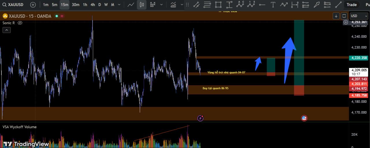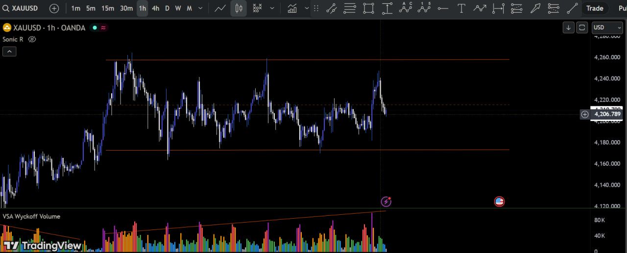 - Giao Dịch trên Mid-Range: Hiện tại, giá đang duy trì ở nửa trên của TR (quanh 4,216$). Điều này nghiêng về kịch bản Tích Lũy (Accumulation), vì phe Cầu đang kiểm soát và giữ giá không để rơi sâu.