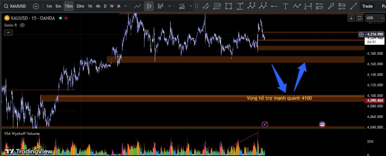 - Hỗ Trợ Vững Chắc: Vùng 4,180$ đã chứng minh là một hỗ trợ cực kỳ vững chắc. Mỗi lần giá chạm đến đây đều có phản ứng bật lên mạnh mẽ (tạo ra đuôi nến dài/khối lượng cầu tăng), cho thấy Lực Cầu (Demand) đang chờ mua tại đây.