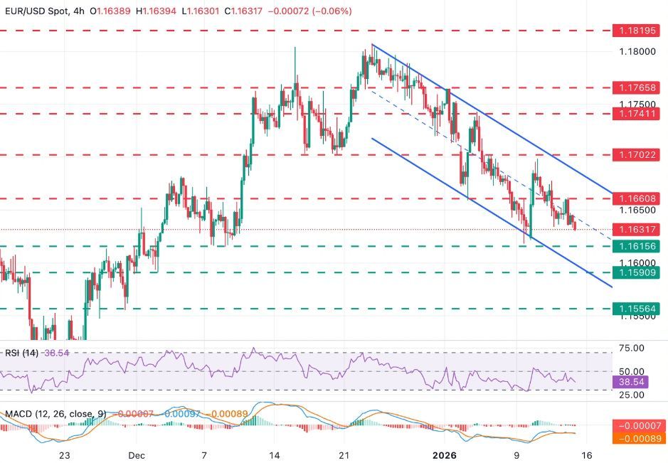 Tỷ giá EUR /USD đang giao dịch ở mức 1.1631, tiếp tục đà đảo chiều từ mức cao nhất tuần gần 1.1700, với giá nằm trong một kênh giảm dần. Chỉ báo MACD (Moving Average Convergence Divergence) duy trì quanh đường 0, cho thấy tín hiệu trung lập, và chỉ báo RSI (Relative Strength Index) ở mức 38, phản ánh động lượng yếu.