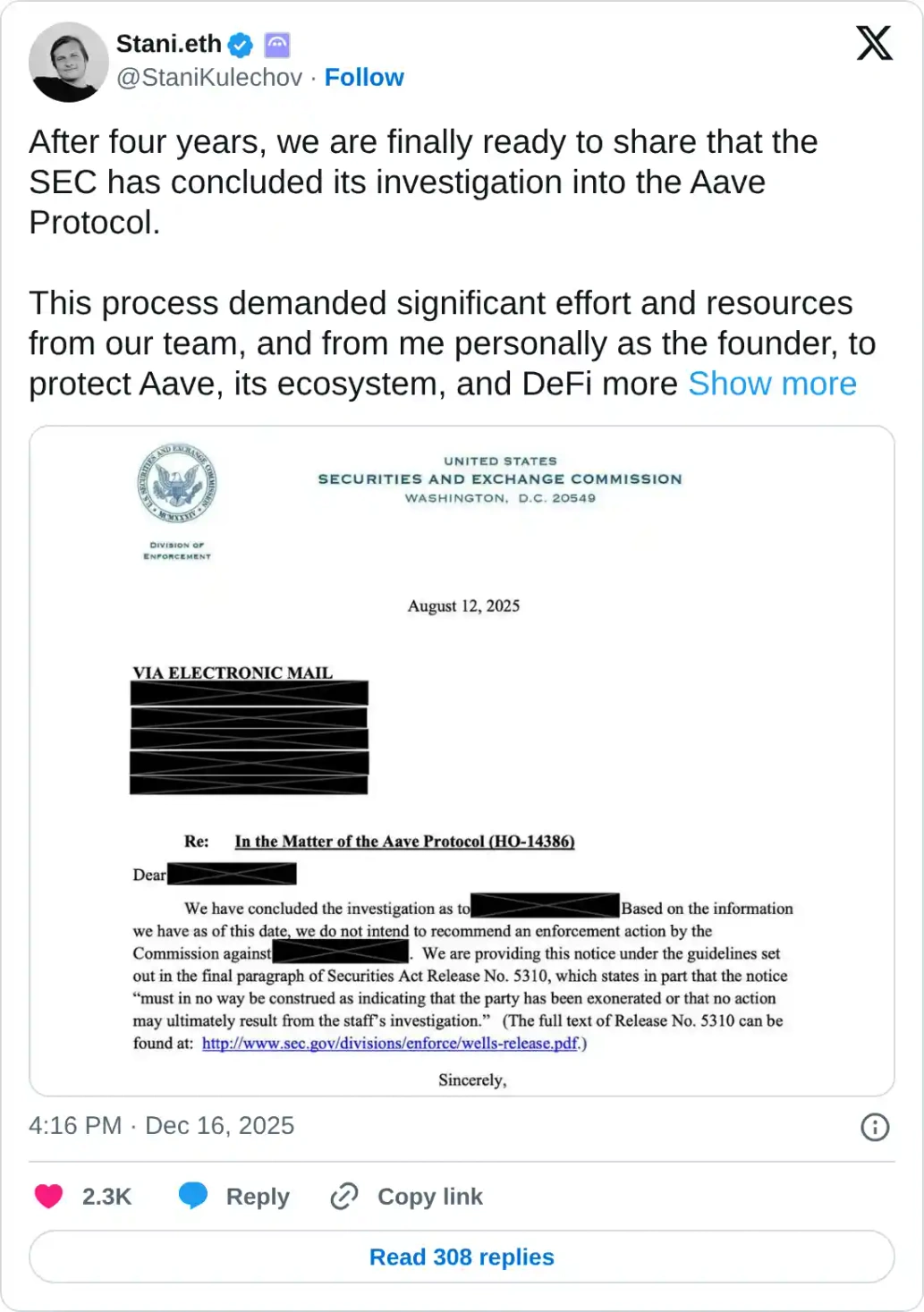 Stani Kulechov, người sáng lập kiêm CEO của giao thức Aave, đã thông báo trên tài khoản X của mình vào thứ Ba rằng Ủy ban Chứng khoán và Giao dịch Hoa Kỳ (SEC) đã kết thúc cuộc điều tra kéo dài 4 năm.