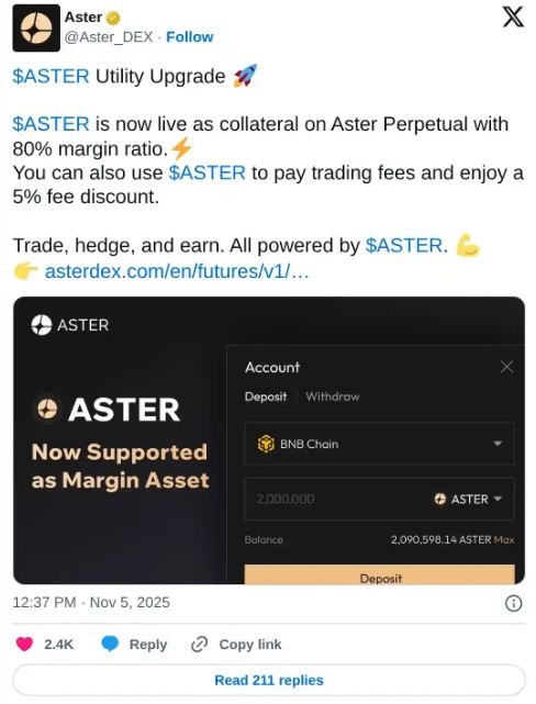 - Aster tăng tiện ích thế chấp với mức ký quỹ 80%, điều này có thể thúc đẩy vị thế tăng giá trên thị trường hợp đồng tương lai.