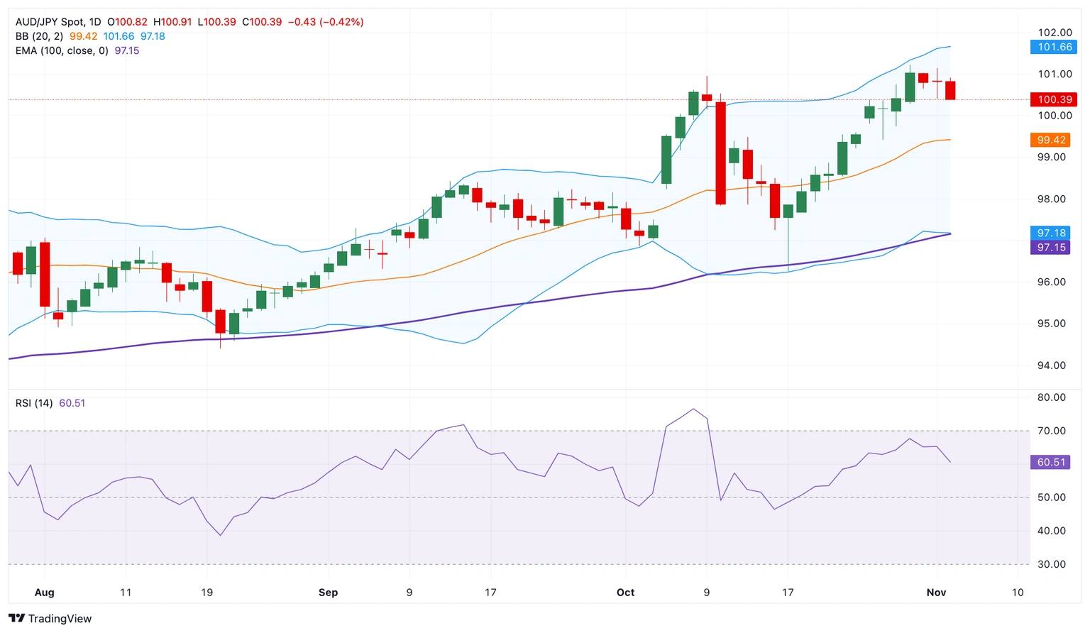 Cặp tỷ giá AUD/JPY thu hút một số nhà đầu tư bán ra ở mức gần 100,50 trong phiên giao dịch đầu giờ sáng thứ Ba tại châu Âu. Đồng Đô la Úc (AUD) suy yếu so với Yên Nhật (JPY) sau khi Ngân hàng Dự trữ Úc (RBA) quyết định giữ nguyên Lãi suất Tiền mặt Chính thức (OCR) ở mức 3,6% tại cuộc họp chính sách tiền tệ tháng 11. Quyết định này phần lớn đã được dự đoán trước sau khi lạm phát trong quý 3 cao hơn dự kiến.