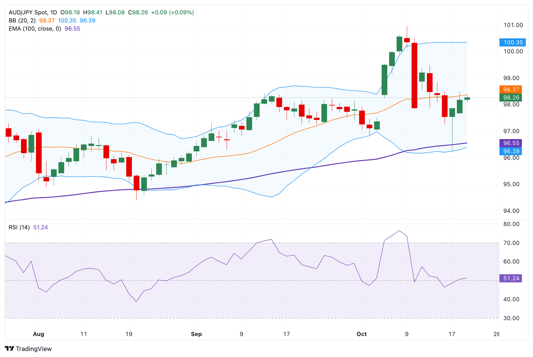Cặp tỷ giá AUD/JPY giao dịch trong vùng tích cực gần 98,25 trong phiên giao dịch châu Âu đầu ngày thứ Ba. Đồng Yên Nhật (JPY) giảm nhẹ so với Đô la Úc (AUD) khi bà Sanae Takaichi, người có quan điểm ôn hòa, chuẩn bị trở thành nữ Thủ tướng đầu tiên của Nhật Bản. Bà Takaichi được dự đoán sẽ trở thành nữ Thủ tướng đầu tiên của Nhật Bản sau khi giành được 237 phiếu bầu tại Hạ viện, nhiều hơn mức cần thiết để đạt được đa số phiếu, theo BBC đưa tin hôm thứ Ba.