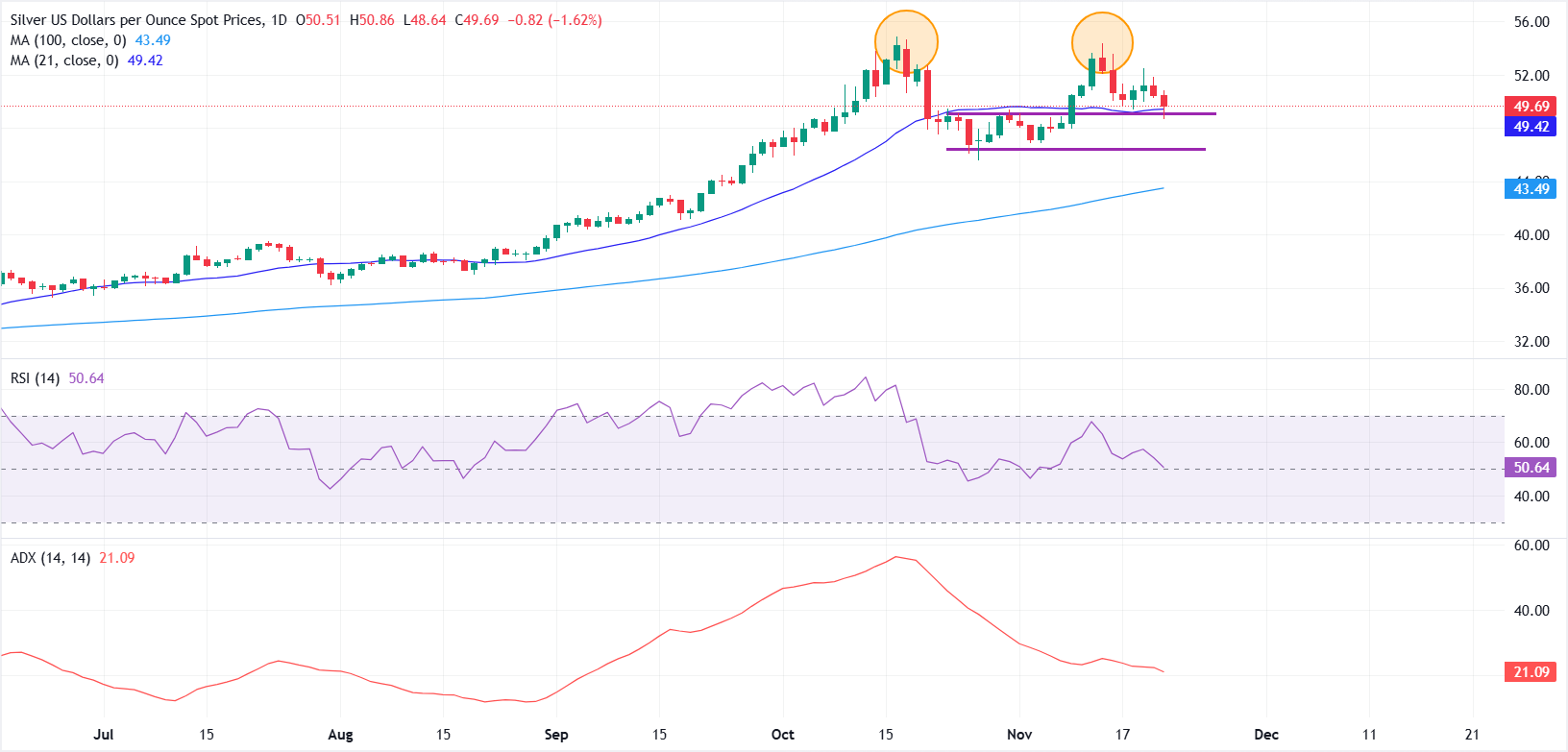 Về mặt kỹ thuật, giá bạc đang cho thấy những dấu hiệu ban đầu của sự suy yếu sau khi hình thành mô hình hai đỉnh trên biểu đồ hàng ngày, với các đỉnh quanh vùng 54,50-55,00 đô la. Mô hình này đang bắt đầu tạo ra áp lực giảm nhẹ, mặc dù đường viền cổ vẫn còn nguyên vẹn, khiến bên bán hiện đang thận trọng.