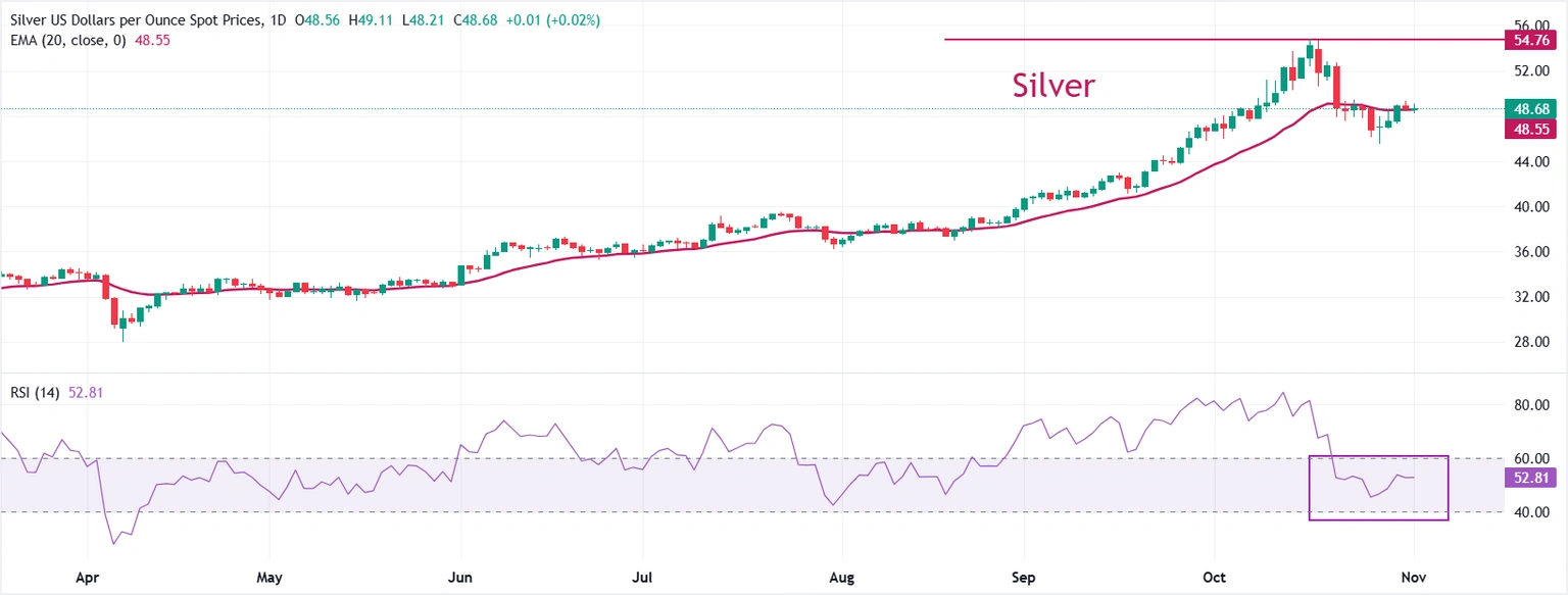 Giá bạc giao dịch trong biên độ hẹp quanh mức 49,00 đô la. Xu hướng ngắn hạn của kim loại quý này dường như đang đi ngang khi giá dao động quanh đường trung bình động hàm mũ (EMA) 20 ngày, hiện đang giao dịch quanh mức 48,70 đô la.
