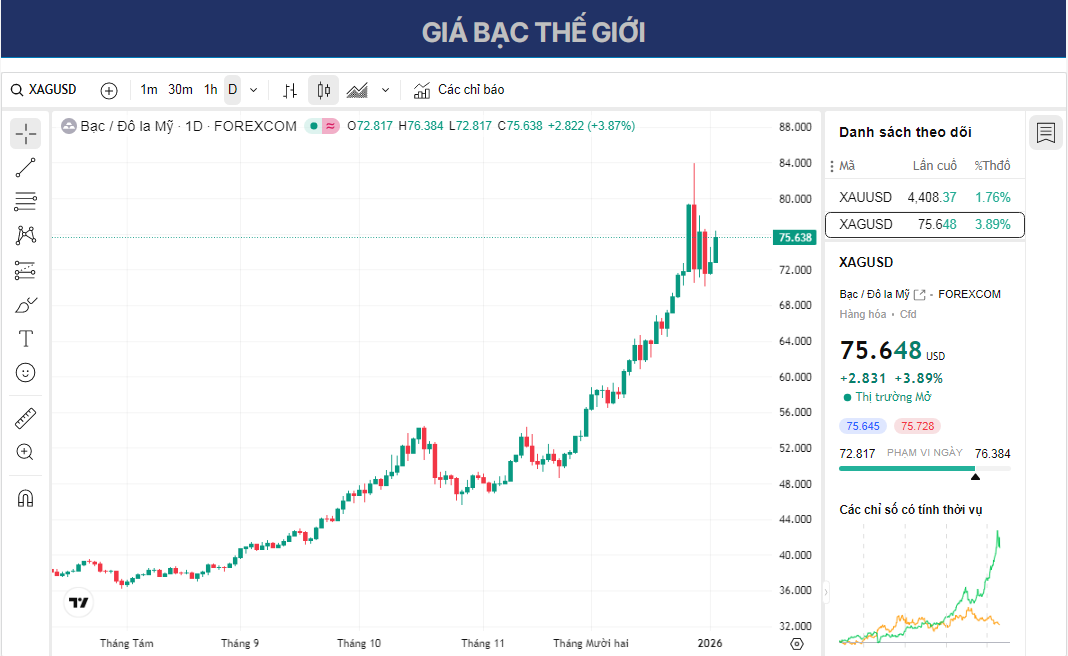 - Giá bạc tăng lên khoảng 75,40 đô la trong phiên giao dịch châu Á ngày thứ Hai.