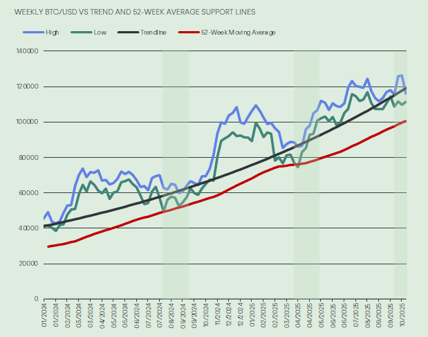 Báo cáo giải thích rằng Bitcoin có thể sẽ quay lại mức 100.000 đô la trong tháng này, có khả năng chạm đến vùng hỗ trợ dài hạn - mức trung bình 52 tuần - như đã từng xảy ra nhiều lần trong những năm gần đây, như thể hiện trong biểu đồ bên dưới.