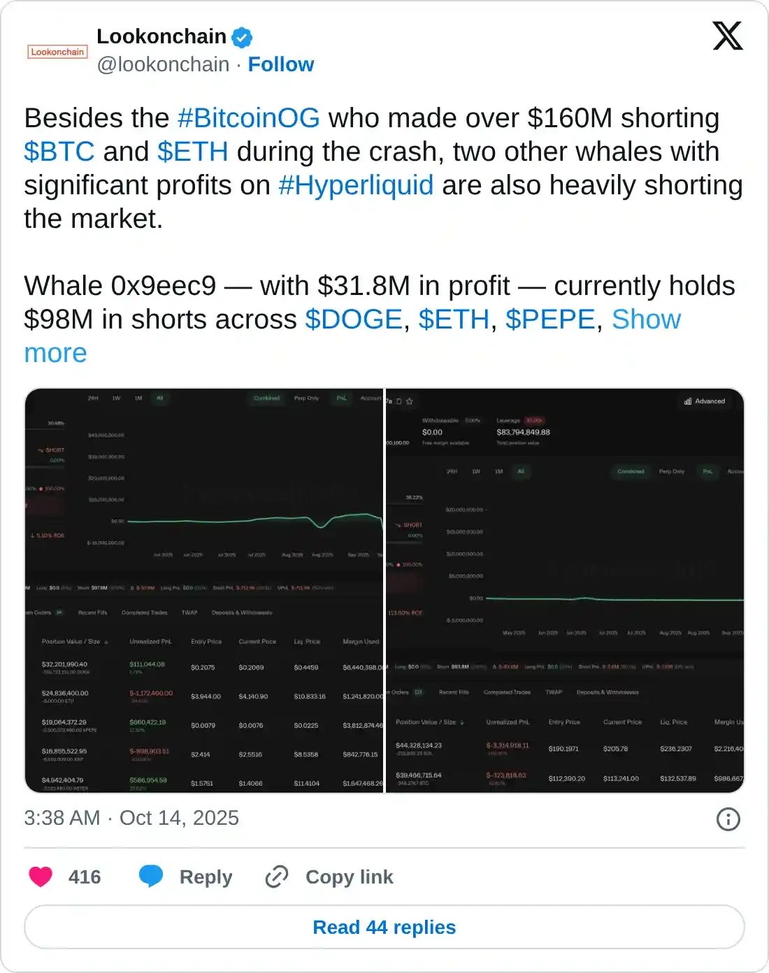 Dữ liệu của Lookonchain cho thấy, bên cạnh BitcoinOG, kiếm được hơn 160 triệu đô la khi bán khống BTC và ETH trong đợt sụp đổ, hai cá voi khác có lợi nhuận đáng kể trên Hyperliquid cũng đang bán khống mạnh thị trường.