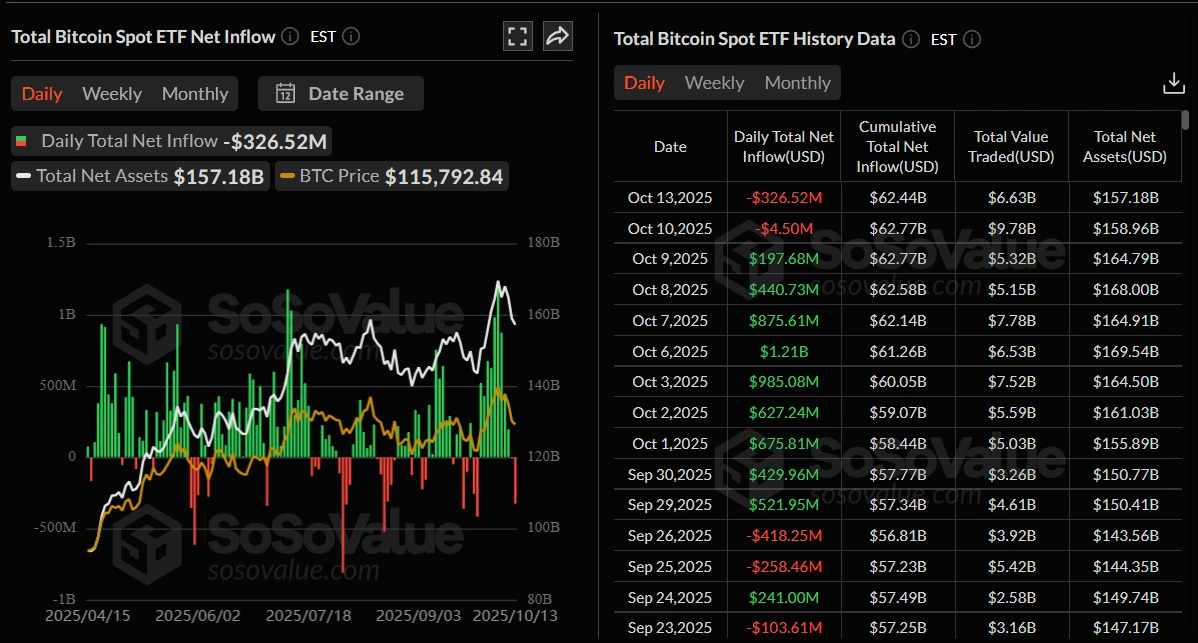 Nhu cầu của các tổ chức đã suy yếu khi tuần mới bắt đầu. Dữ liệu của SoSoValue cho thấy các quỹ ETF Bitcoin giao ngay đã ghi nhận dòng vốn rút ra 326,25 triệu đô la vào thứ Hai, đánh dấu ngày thứ hai liên tiếp dòng vốn rút ra kể từ thứ Sáu. Nếu dòng vốn rút ra này tiếp tục mạnh hơn, giá BTC có thể sẽ tiếp tục điều chỉnh.