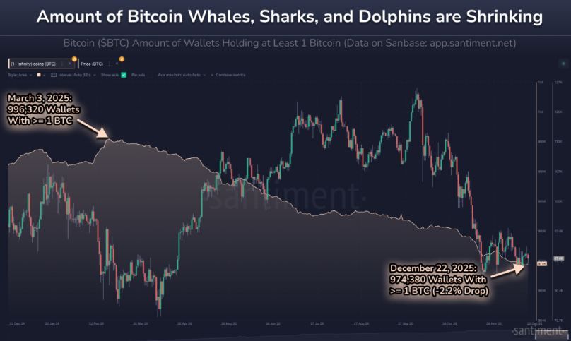 - Dữ liệu của Santiment cho thấy số lượng "cá voi", "cá mập" và "cá heo" Bitcoin đang giảm, cho thấy sự tham gia của các nhà đầu tư lớn đang giảm sút.