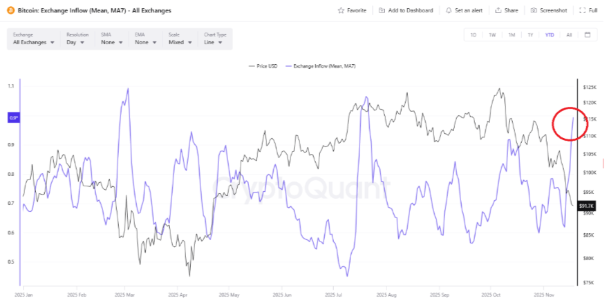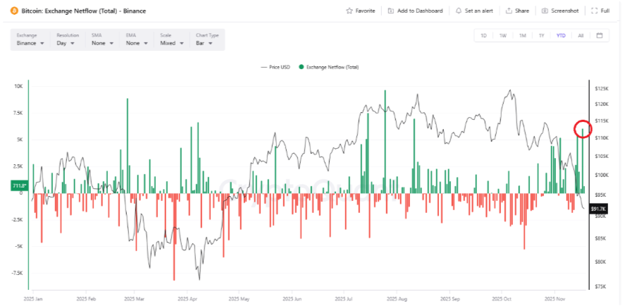 Hơn nữa, chỉ số Dòng tiền giao dịch ròng tiếp tục phản ánh tâm lý bi quan, với dòng tiền chảy vào vượt quá 5.000 BTC vào thứ Hai — áp lực bán trong một ngày mạnh nhất kể từ giữa tháng 8.