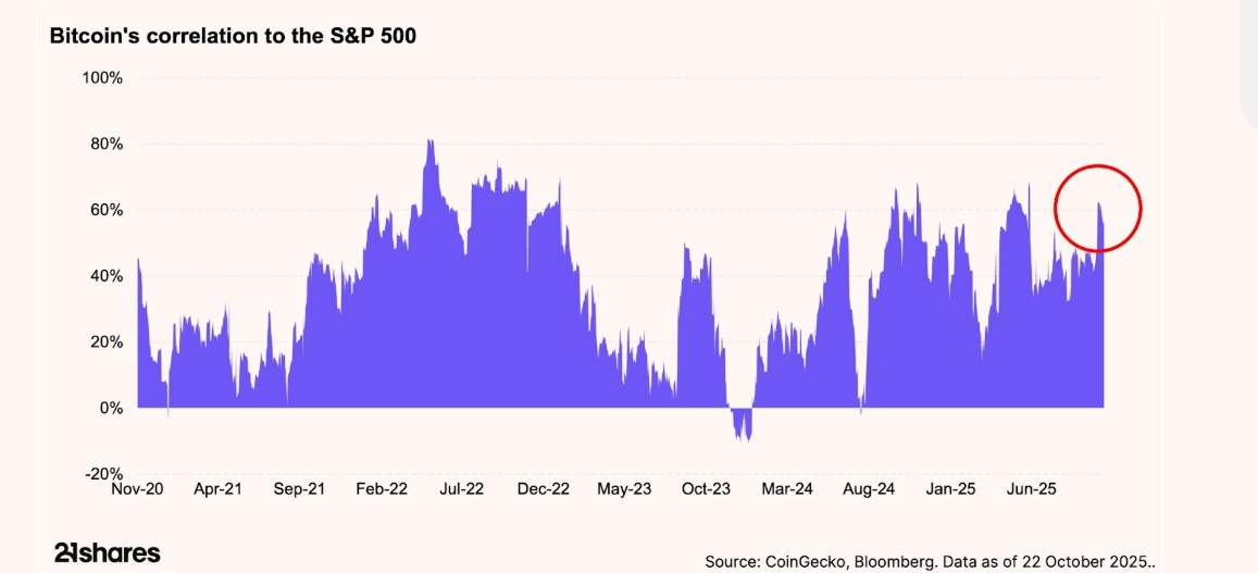 Báo cáo hàng tuần của 21Shares lưu ý rằng sự sụp đổ của thị trường vào ngày 10 tháng 10 là do Tổng thống Trump đề xuất áp thuế 100% đối với hàng nhập khẩu từ Trung Quốc, làm dấy lên lo ngại về chiến tranh thương mại và đẩy mối tương quan của Bitcoin với S&P 500 lên trên 60%.