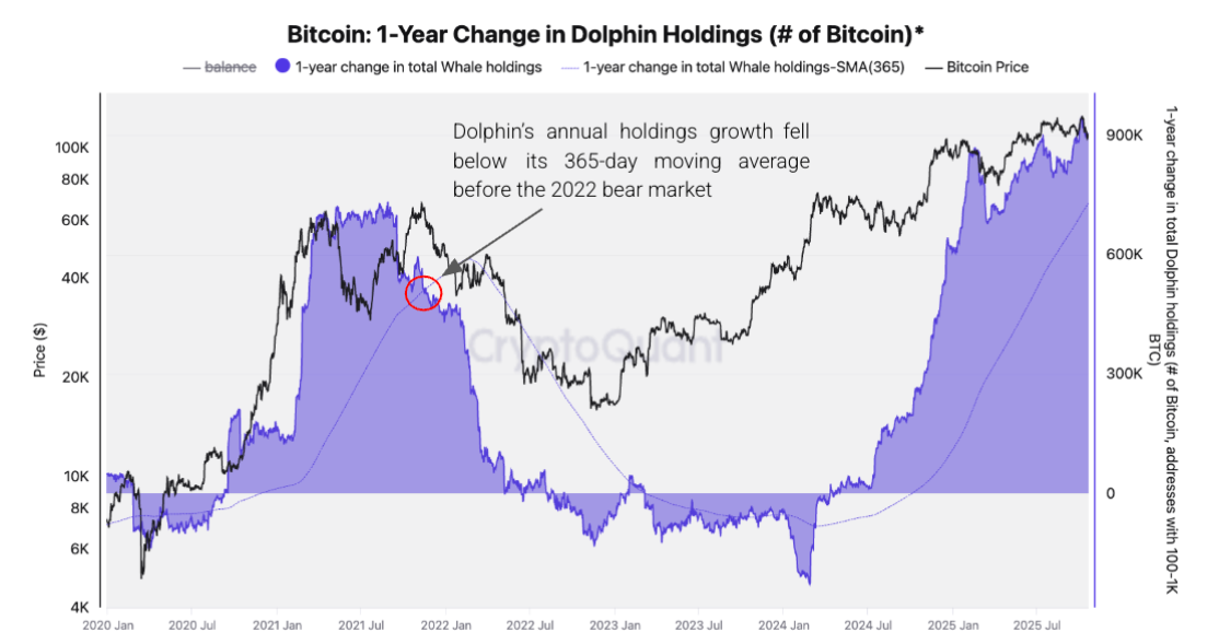 Biểu đồ bên dưới cho thấy về mặt lịch sử, sự kết thúc của chu kỳ tăng giá Bitcoin thường trùng với sự suy giảm tốc độ tăng trưởng hàng năm của lượng nắm giữ Dolphin. Trong thời kỳ đỉnh điểm năm 2021, mức tăng trưởng hàng năm của nhóm này đã giảm xuống dưới đường trung bình động 365 ngày, báo hiệu sự đảo ngược nhu cầu và sau đó là sự điều chỉnh giá.