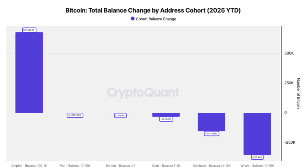 Báo cáo giải thích rằng nhóm Dolphin - bao gồm các quỹ ETF, tập đoàn và nhà đầu tư lớn - vẫn là trụ cột của cấu trúc nhu cầu trong chu kỳ này. Tính đến thời điểm hiện tại của năm nay, nhóm Dolphin là nhóm tích lũy chính, tăng tổng số dư lên hơn 681.000 BTC, trong khi tất cả các nhóm địa chỉ khác đều chứng kiến sự sụt giảm ròng về lượng nắm giữ. Sự phân kỳ này cho thấy các nhà đầu tư lớn và các tổ chức đã hấp thụ nguồn cung từ các bên tham gia thị trường nhỏ hơn, tạo ra một cơ sở nhu cầu cơ bản mạnh mẽ trong chu kỳ gần đây.