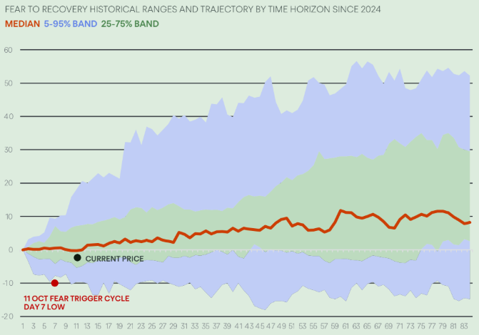 Báo cáo đã phân tích dữ liệu bao gồm hơn 40 sự kiện lo sợ kể từ năm 2024, mỗi sự kiện được chuẩn hóa trong khoảng thời gian 84 ngày để nắm bắt toàn bộ chu kỳ từ Lo sợ đến Phục hồi. Diễn biến tháng 10 gần như phản ánh hoàn hảo mô hình lịch sử: một đợt điều chỉnh nhanh -10%, một đợt củng cố kéo dài 11 ngày và một xu hướng thống kê thiên về mức phục hồi 15–30% trong 8–12 tuần tiếp theo. Mặc dù tâm lý ngắn hạn vẫn thận trọng, dữ liệu cho thấy rõ ràng rằng lo sợ vẫn là một sự thiết lập lại, chứ không phải là một sự đảo chiều.
