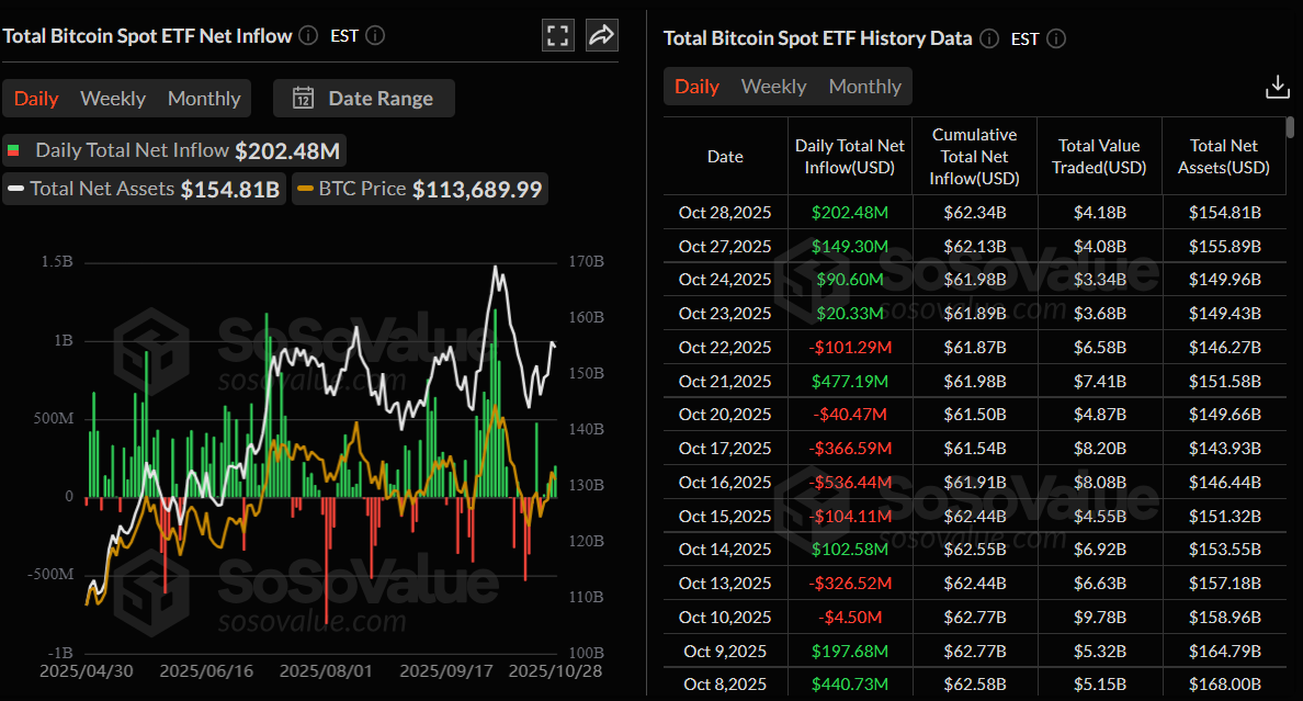 Bitcoin (BTC) vẫn ổn định quanh mức 113.000 đô la tại thời điểm viết bài vào thứ Tư, do các nhà giao dịch thận trọng trước các yếu tố vĩ mô và doanh nghiệp quan trọng. Cục Dự trữ Liên bang Hoa Kỳ (Fed) dự kiến sẽ công bố quyết định lãi suất, và các gã khổng lồ công nghệ Microsoft, Alphabet, Meta, Apple và Amazon chuẩn bị công bố báo cáo thu nhập, điều này có thể mang lại biến động mới cho cả thị trường truyền thống và tiền điện tử. Trong khi đó, các Quỹ Giao dịch Trao đổi (ETF) Bitcoin giao ngay niêm yết tại Hoa Kỳ tiếp tục cho thấy nhu cầu mạnh mẽ, ghi nhận dòng vốn 202,48 triệu đô la vào thứ Ba, kéo dài chuỗi bốn ngày tăng trưởng.