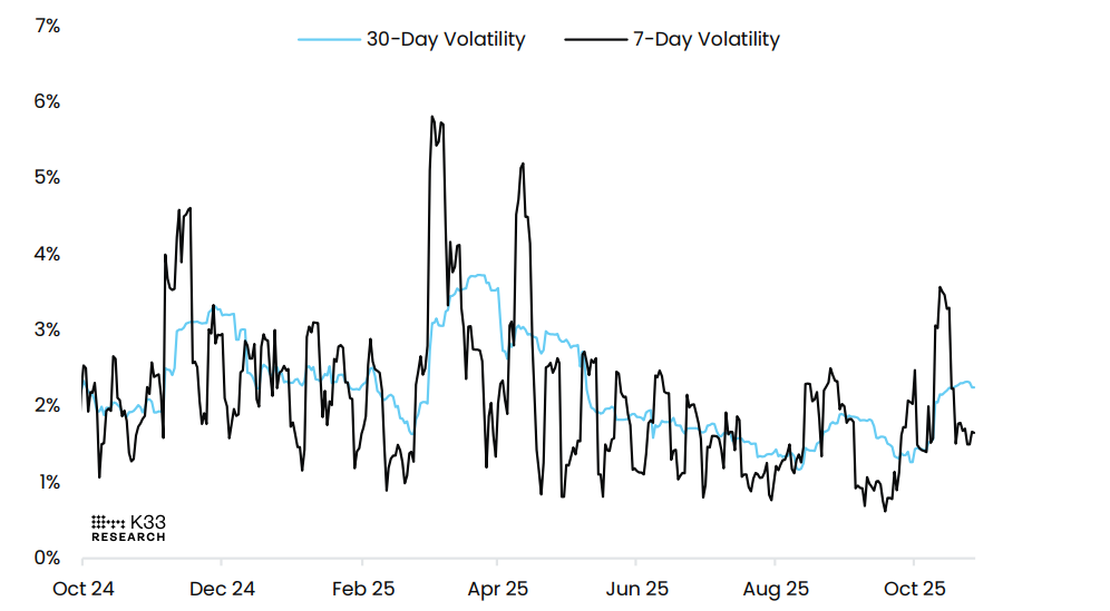 Biểu đồ biến động của Bitcoin cho thấy diễn biến thị trường hiện tại. Mặc dù mức biến động trung bình 7 ngày của Bitcoin đã giảm từ 1,8% xuống còn 1,6%, nhưng những biến động trong ngày vẫn đáng kể. Vào ngày 21 tháng 10, BTC đã tăng 5% và quay lại toàn bộ đà tăng trong cùng khoảng thời gian 24 giờ — một hiện tượng hiếm gặp báo hiệu thanh khoản bị hạn chế và thường xuất hiện gần các mức giá cực đoan. Đáng chú ý, các mô hình tăng và giảm như vậy đã không được quan sát thấy kể từ cơn bão thuế quan đầu tháng 4, khoảng 193 ngày trước. Các nhà giao dịch nên thận trọng với những biến động sắp tới.