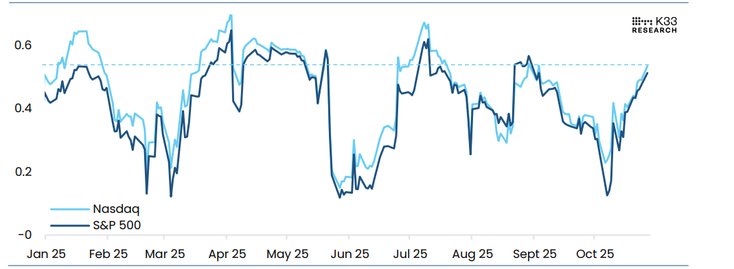 Biểu đồ bên dưới cho thấy mối tương quan giữa BTC và cổ phiếu Mỹ đã tăng lên gần đây. Hệ số tương quan 30 ngày giữa BTC và Nasdaq đã tăng lên 0,53, mức cao nhất kể từ cuối tháng 8. Với mối tương quan cao, thu nhập và FOMC sẽ ảnh hưởng đáng kể đến xu hướng của BTC.