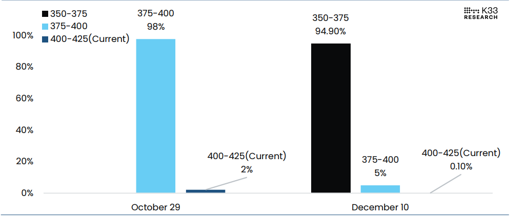 Hiện tại, thị trường đang định giá 98% khả năng lãi suất sẽ giảm 25 điểm cơ bản vào thứ Tư và 94,9% khả năng lãi suất sẽ giảm thêm 25 điểm cơ bản nữa sau cuộc họp FOMC vào ngày 10 tháng 12.