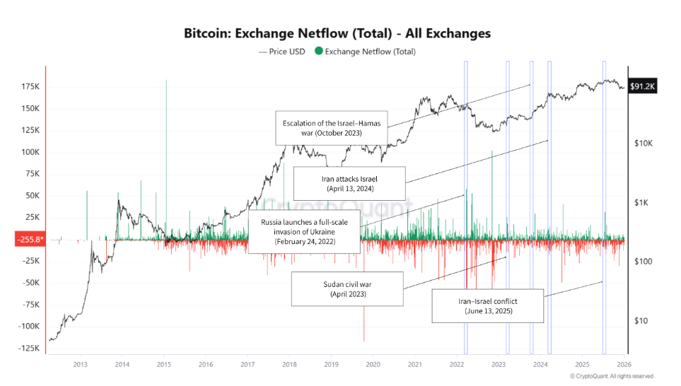 Diễn biến này đã đưa rủi ro địa chính trị trở lại tâm điểm chú ý. Mặc dù những tin tức như vậy thường gây lo ngại trên thị trường toàn cầu, nhưng chỉ số Netflow của CryptoQuant Exchange, theo dõi việc Bitcoin có được chuyển vào hay ra khỏi các sàn giao dịch hay không, cho thấy một kịch bản khá bình tĩnh trong giới giao dịch.