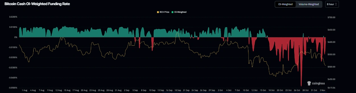 Dữ liệu Tỷ lệ Tài trợ Trọng số OI của Coinglass cho thấy số lượng nhà giao dịch đặt cược rằng giá BCH sẽ tiếp tục giảm cao hơn so với số lượng nhà giao dịch dự đoán giá sẽ tăng. Chỉ số này đã chuyển sang mức âm vào thứ Ba, xuống còn 0,0039%, cho thấy bên bán đang trả lãi cho bên mua. Trong lịch sử, như được thể hiện trong biểu đồ bên dưới, khi tỷ lệ tài trợ chuyển từ dương sang âm, giá BCH đã giảm mạnh.